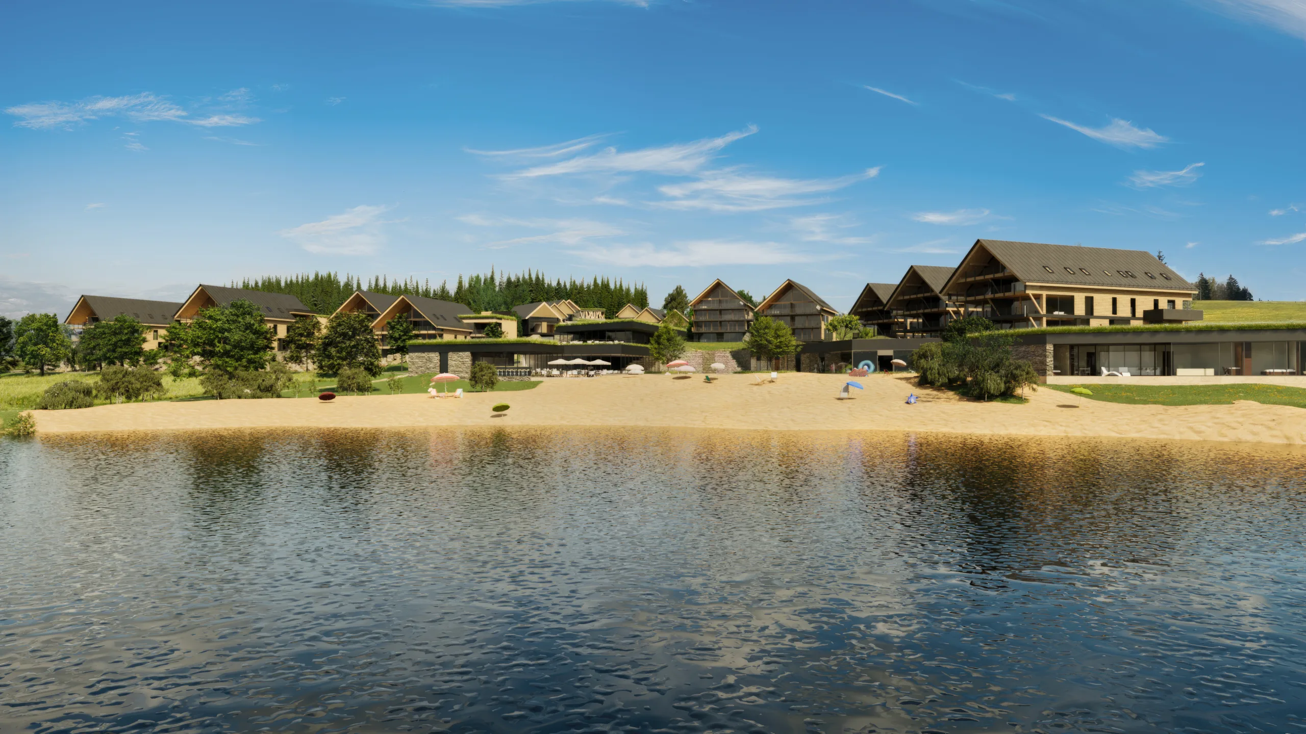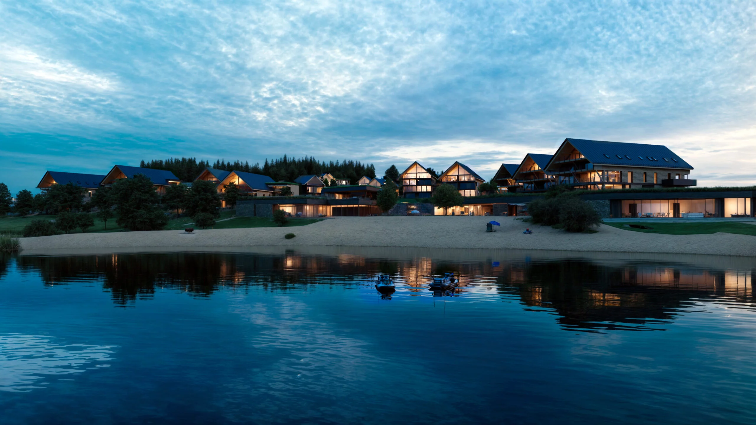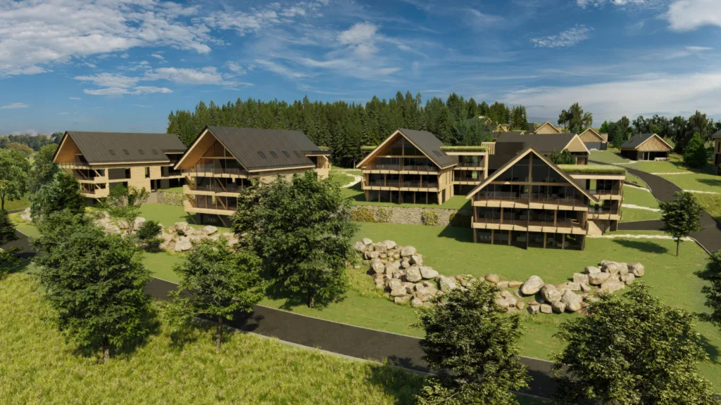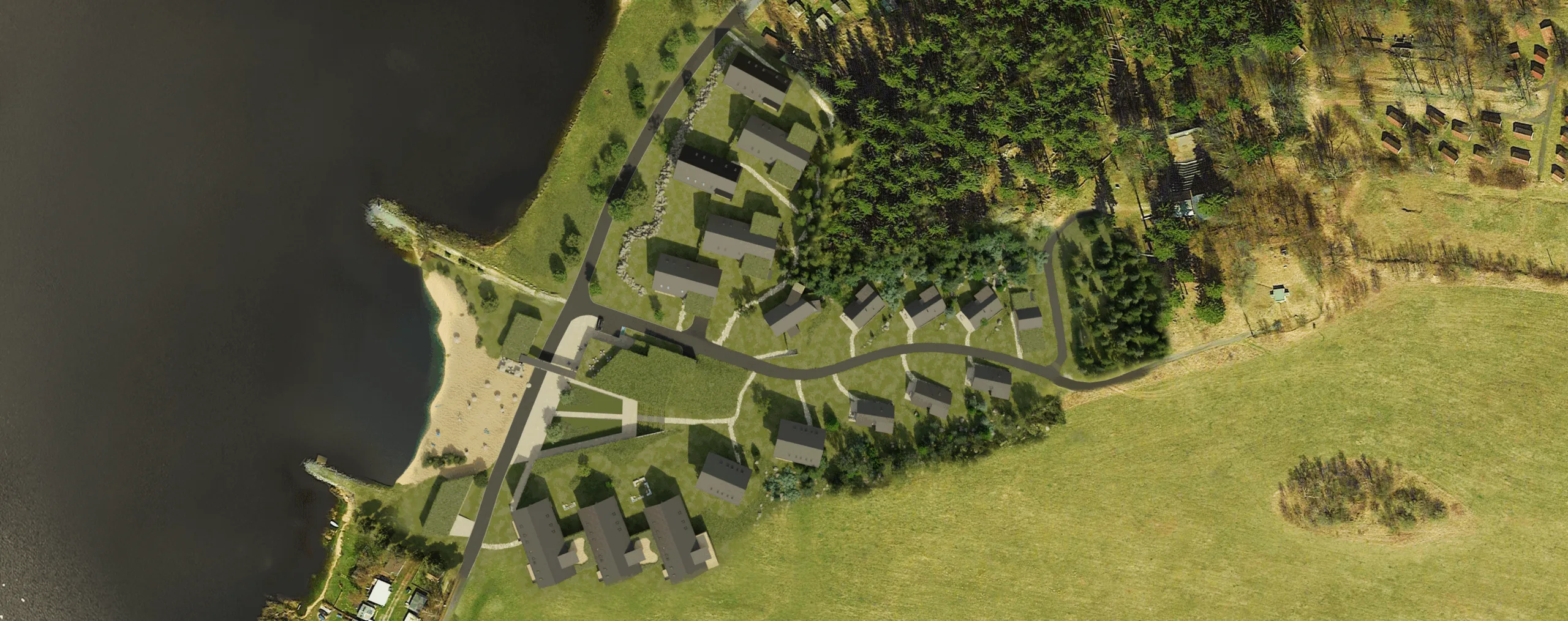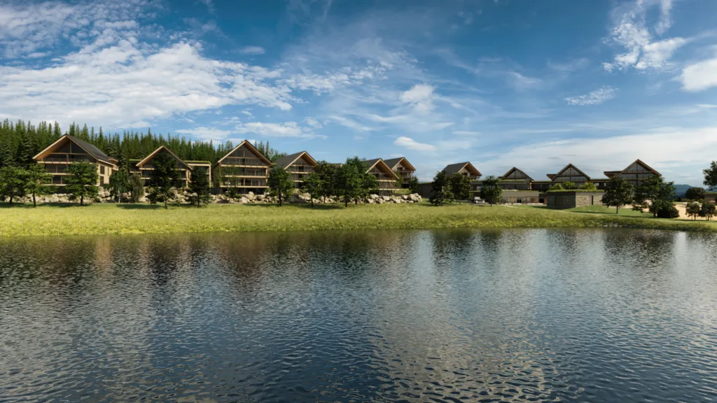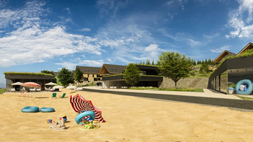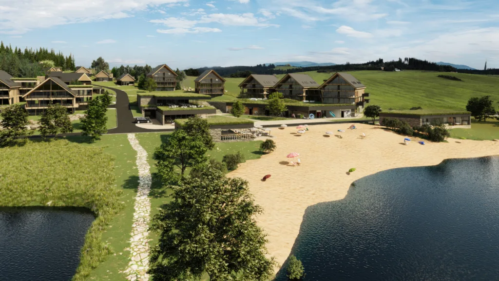 Soutěž vyhráli Fusion Architects se svým návrhem stavení se sedlovými střechami, rozloženými do celého prostoru, umístěnými tak, aby si navzájem nebránily v přímém výhledu na přehradu. Díky tomu projekt počítá s apartmánovou částí, částí chaletů, hotelovou částí, apartmánovým domem, parkováním povětšinou pod zemí, náměstíčkem s obchůdky a restaurací, wellness a přímým přístupem na pláž. Vše z důrazem na přírodní materiály, zejména dřevo.
