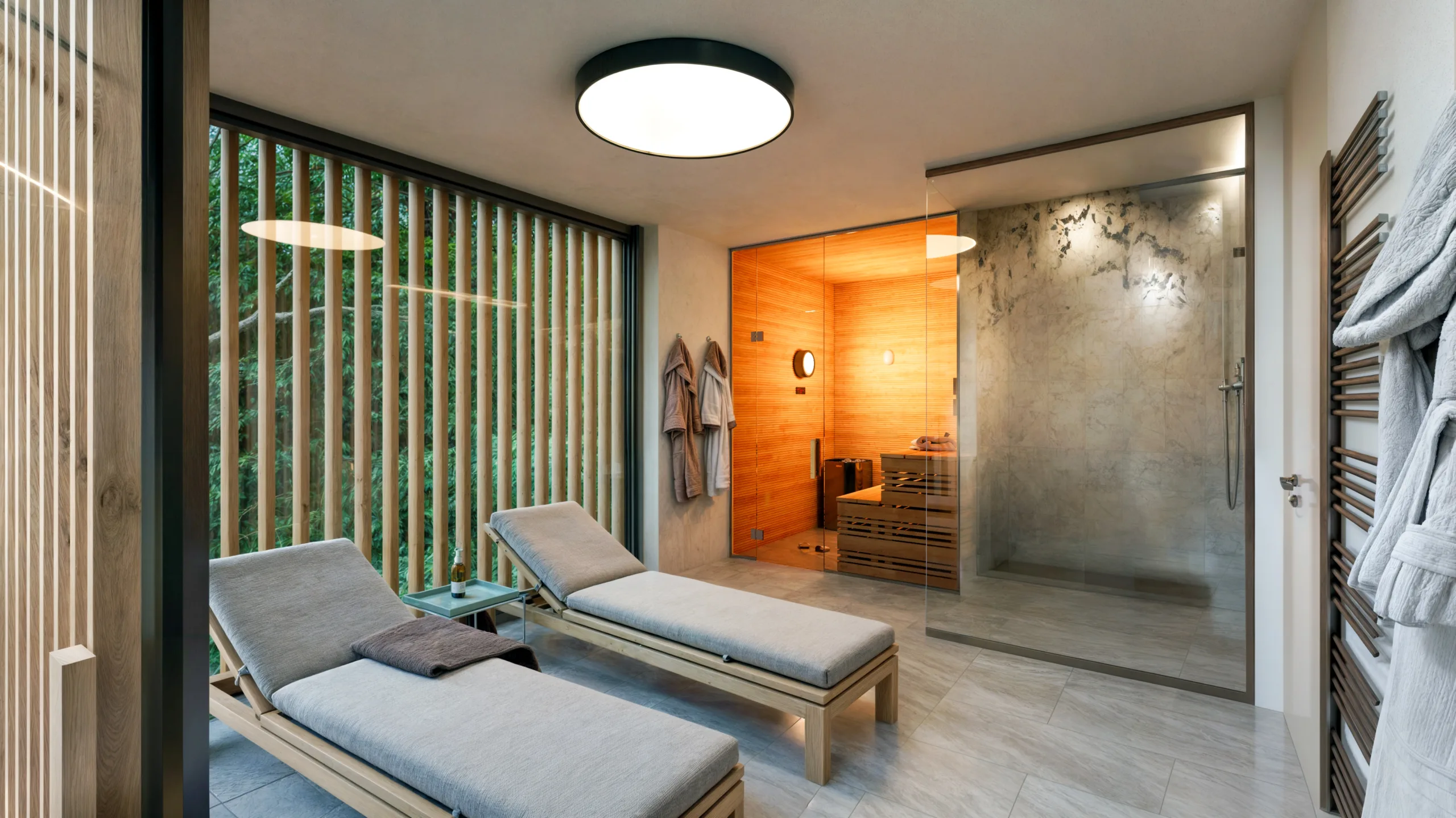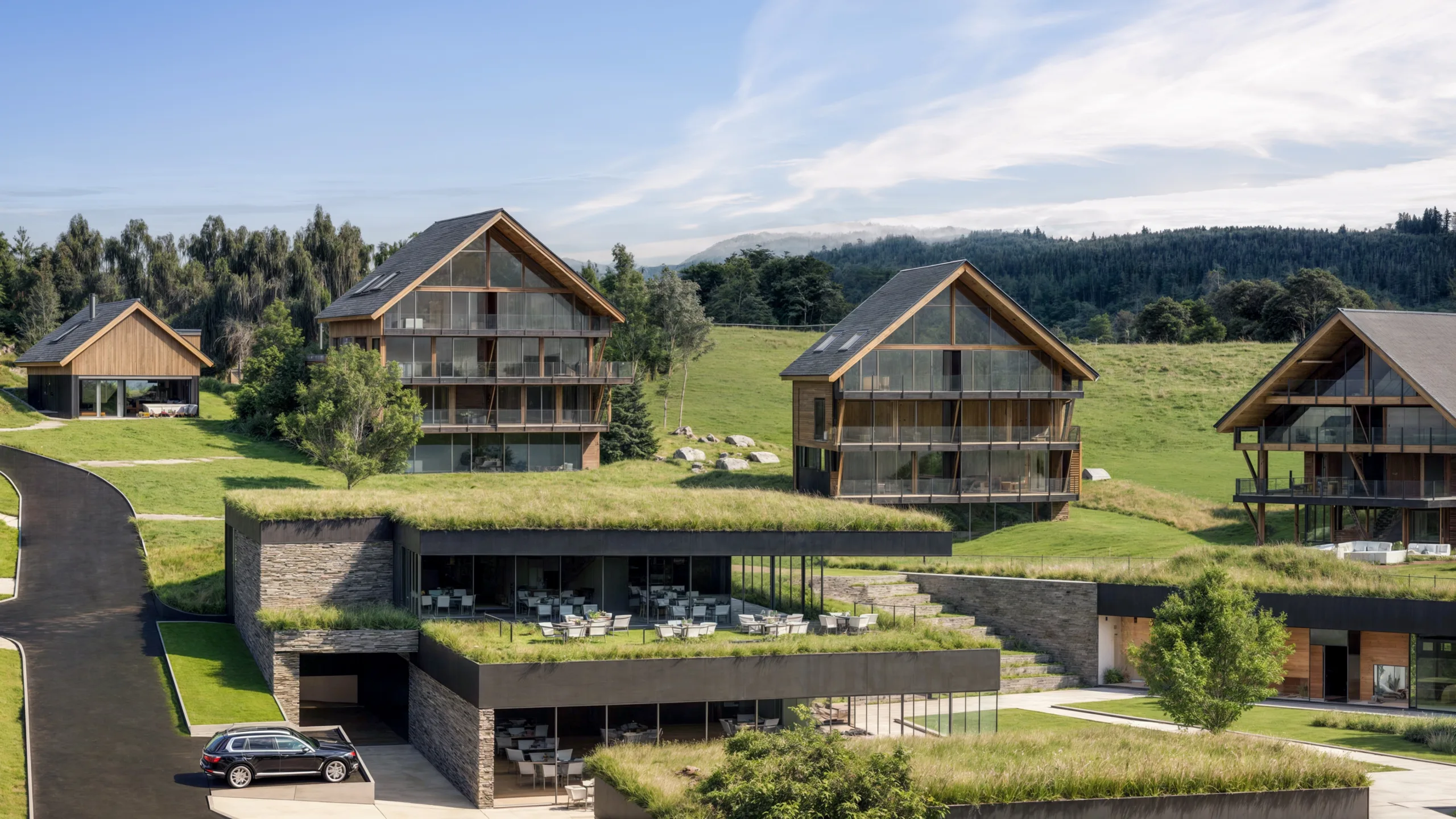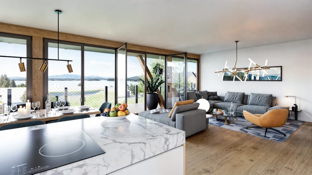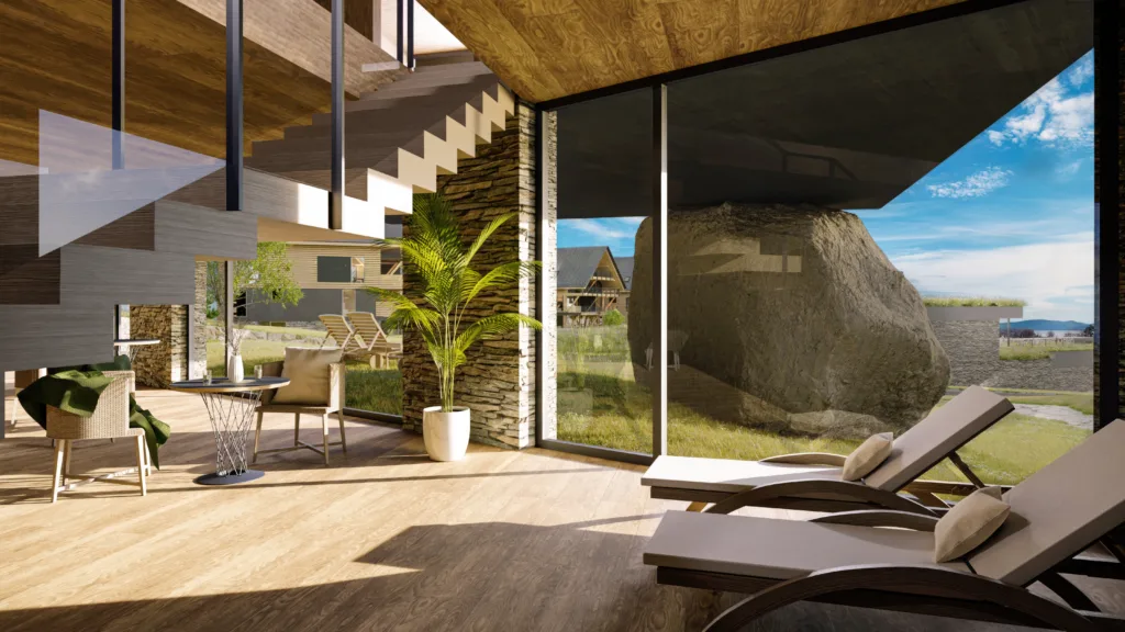 Šest apartmánů ve vile nad resortem nabízí soukromí, parkovací stání i wellness. Vila architektonicky zapadá do resortu, což vytváří pocit ucelenosti území. Resort byl navržen citlivě k lokalitě, kde se nachází. Namísto mohutných resortních hotelů pracuje s celou plochou a rozkládá do více domů, které nemají ambici vyčnívat. Přes tuto rozptýlenost má každý apartmán, chalet i hotelový pokoj přímý výhled na hladinu Lipna. Podobně citlivě jsme přistoupili i k volbě materiálů, protože dřevo zkrátka na Šumavu patří.