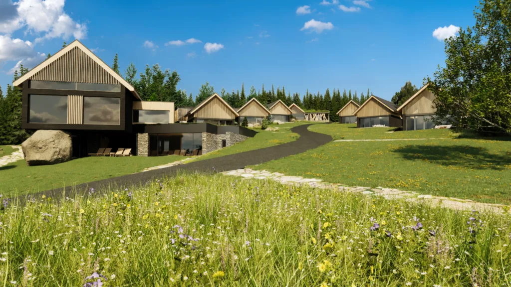 Ve svahu nad rekreačním resortem s hotelem a restaurací postavíme sedm solitérních chaletů ze dřeva. Díky terénu bude mít každý z chaletů nádherný výhled přímo na lipenskou přehradu, ale zároveň v klidném prostředí u lesa, které není tranzitní a dává tak svým obyvatelům soukromí od plážového ruchu. Chalety však nejsou nijak daleko od přehrady a ke všem radostem spojeným s koupáním, vodními i suchozemskými sporty, wellness relaxací, nákupy i jídlem je to jen pár kroků.