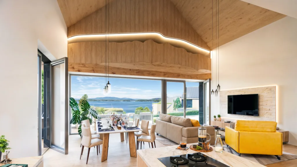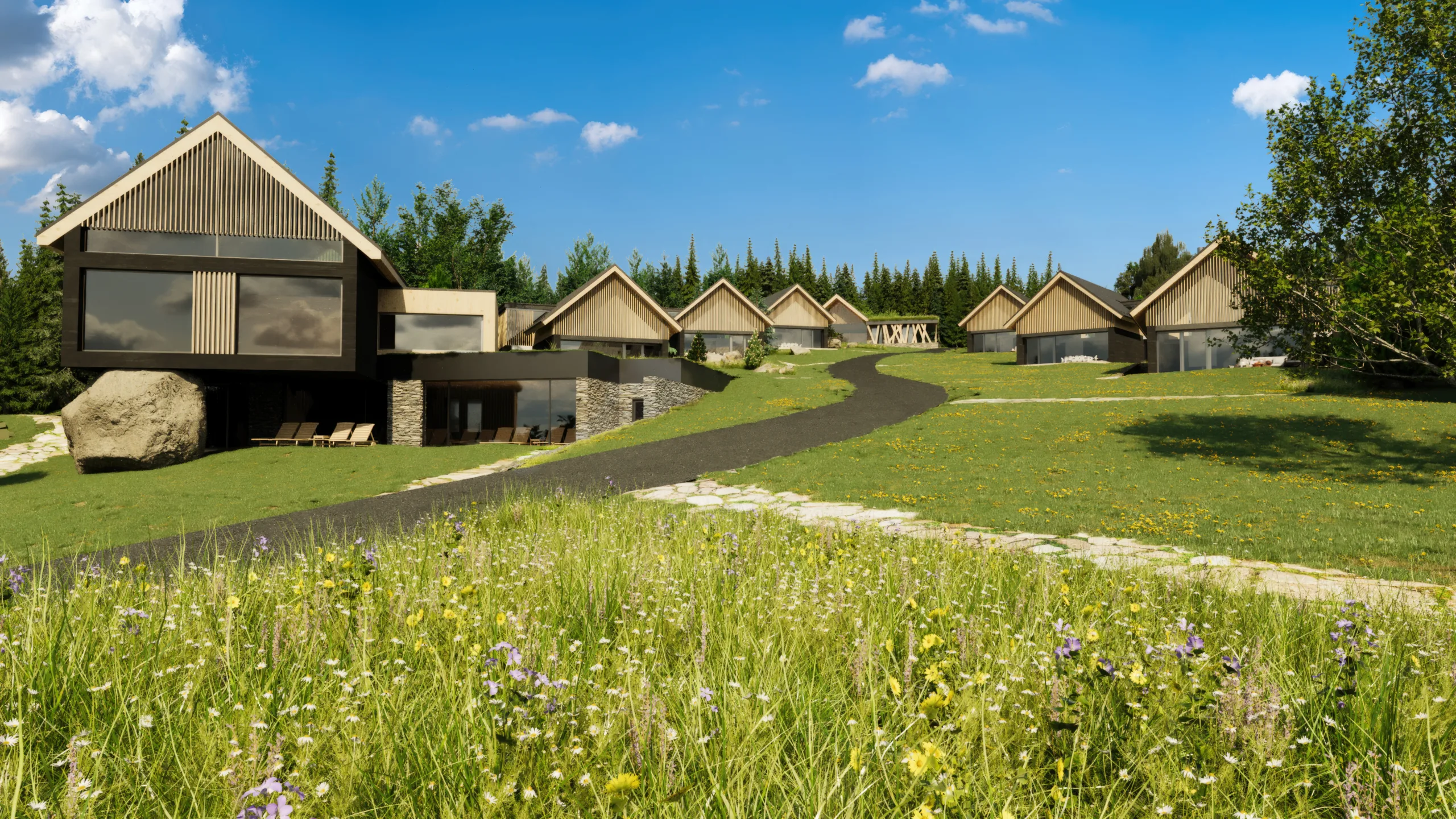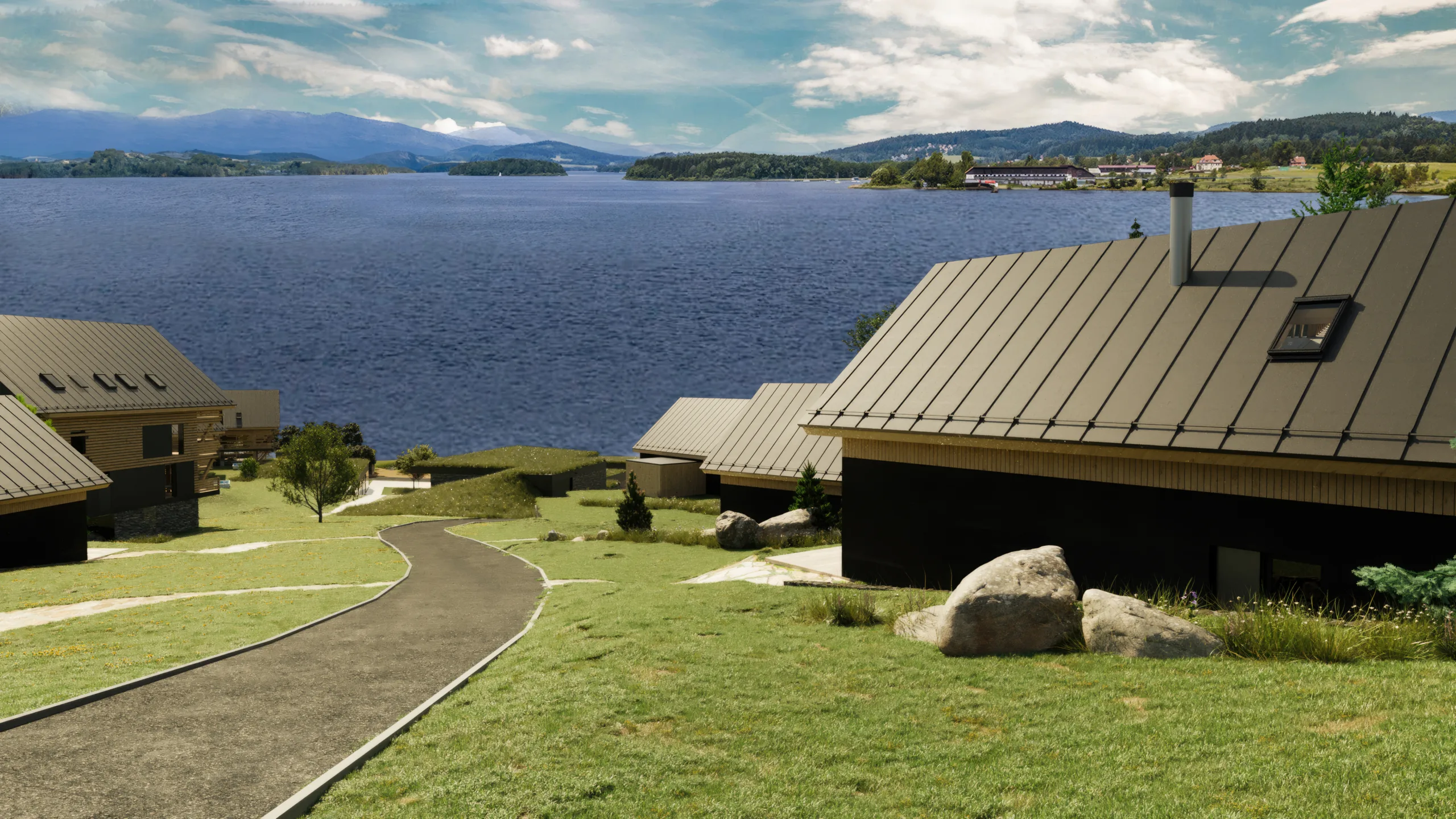 Sedm solitérních chaletů nad resortem nabízí soukromí, vlastní zahradu, parkovací stání i wellness. Chalety architektonicky zapadají do resortu, což vytváří pocit ucelenosti území. Resort byl navržen citlivě k lokalitě, kde se nachází. Namísto mohutných resortních hotelů pracuje s celou plochou a rozkládá do více domů, které nemají ambici vyčnívat. Přes tuto rozptýlenost má každý chalet, apartmán i hotelový pokoj přímý výhled na hladinu Lipna. Podobně citlivě jsme přistoupili i k volbě materiálů, protože dřevo zkrátka na Šumavu patří.
